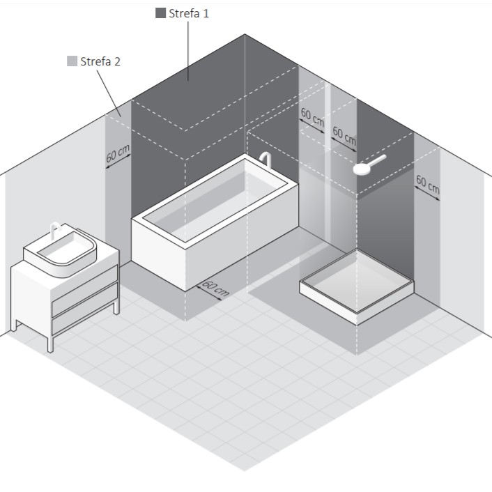 Należy również pamiętać o STREFIE OCHRONNEJ, która obejmuje szerokość 60 cm od STREFY X i ma zapewnić odpowiedni dystans wody oraz wilgoci od urządzeń elektrycznych w pomieszczeniu. Normy dotyczące instalacji elektrycznych niskiego napięcia w pomieszczeniach mokrych wskazują, że najbezpieczniejszym miejscem instalacji grzejnika elektrycznego jest przestrzeń poza STREFĄ OCHRONNĄ.