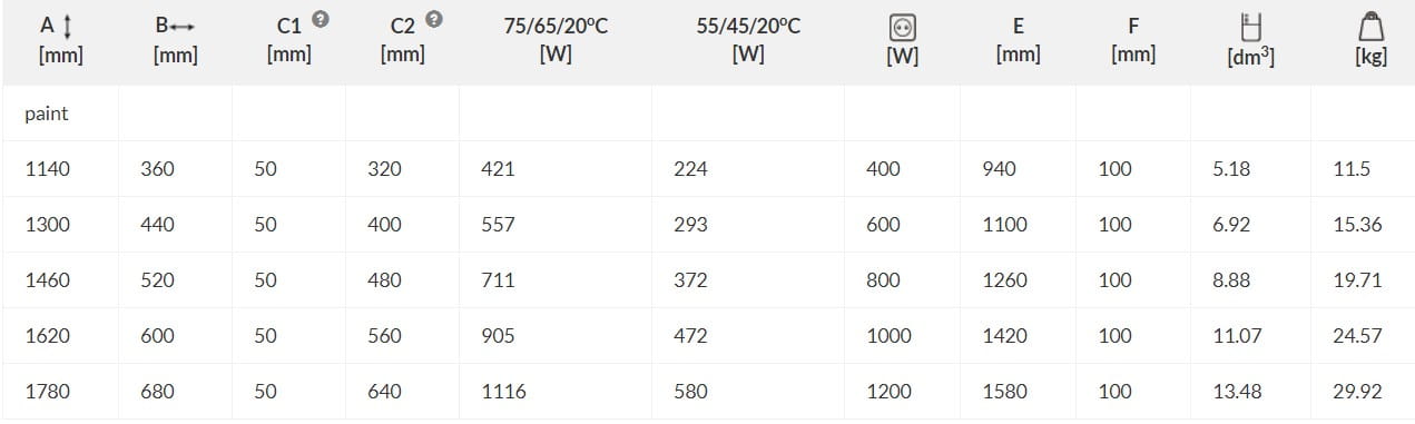 Dane techniczne grzejników