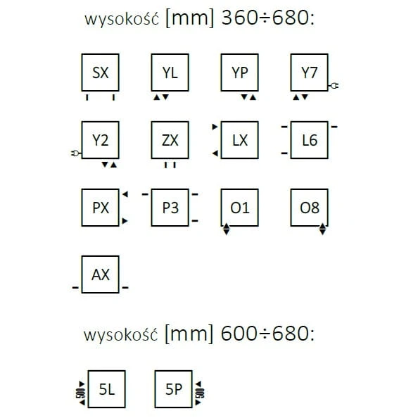 Wybierz SX - dolne ZX - dolne zespolone LX - lewy bok PX - prawy bok O1 - lewe jednootworowe O8 - prawe jednootworowe YP - dolne prawe YL - dolne lewe Y2 - dolne P + wejście na grzałkę Y7 - dolne L + wejście na grzałkę AX - dolne P_L L6 P3