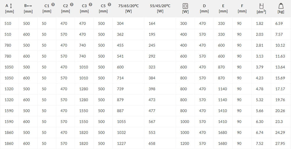 Dane techniczne grzejników