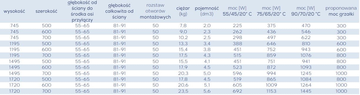 Dane techniczne grzejników