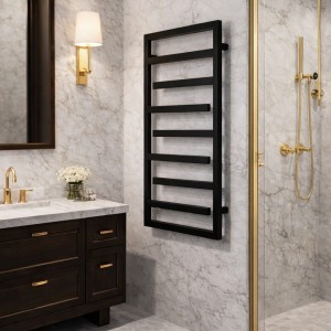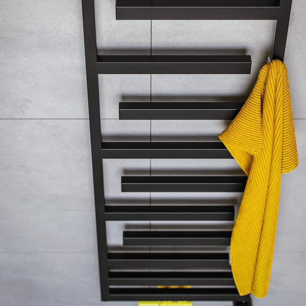Asymetryczne poprzeczki nadają mu lekkości, a jednocześnie zapewniają wygodne miejsce do suszenia ręczników - bez chaosu wizualnego.