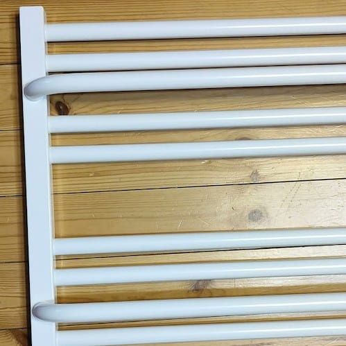 Wysunięte rurki tworzą relingi, na których możesz zawiesić ręczniki, co sprawia, że grzejnik nie tylko ogrzeje pomieszczenie, ale także będzie praktycznym elementem wyposażenia łazienki.
