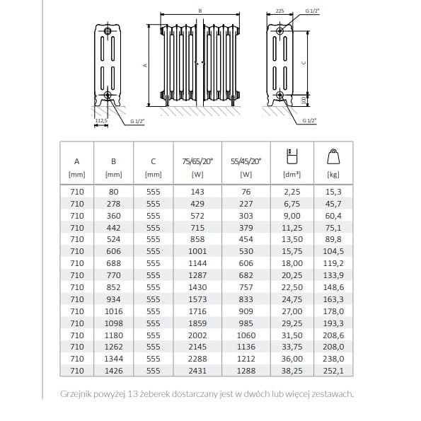 UWAGA - w przypadku kiedy grzejnik jest dłuższy niż 13 żeberek (1098 mm) wysyłany jest w częściach. Do zamontowania grzejnika konieczne jest użycie klucza. Na potrzeby klienta istnieje możliwość wypożyczenia klucza za kaucją.