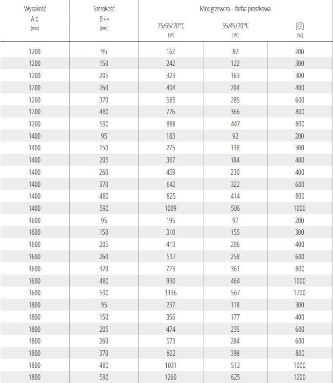 ✅ moc grzejników zależnie od rozmiaru od 160 do 1260 W