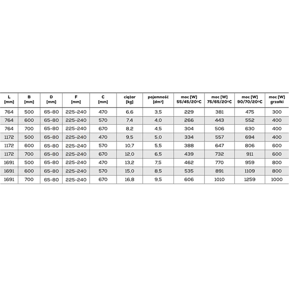 Dane techniczne grzejników