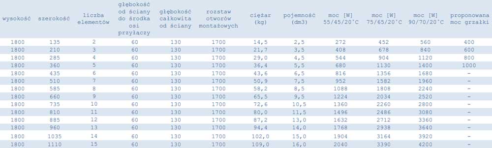 Dane techniczne grzejników