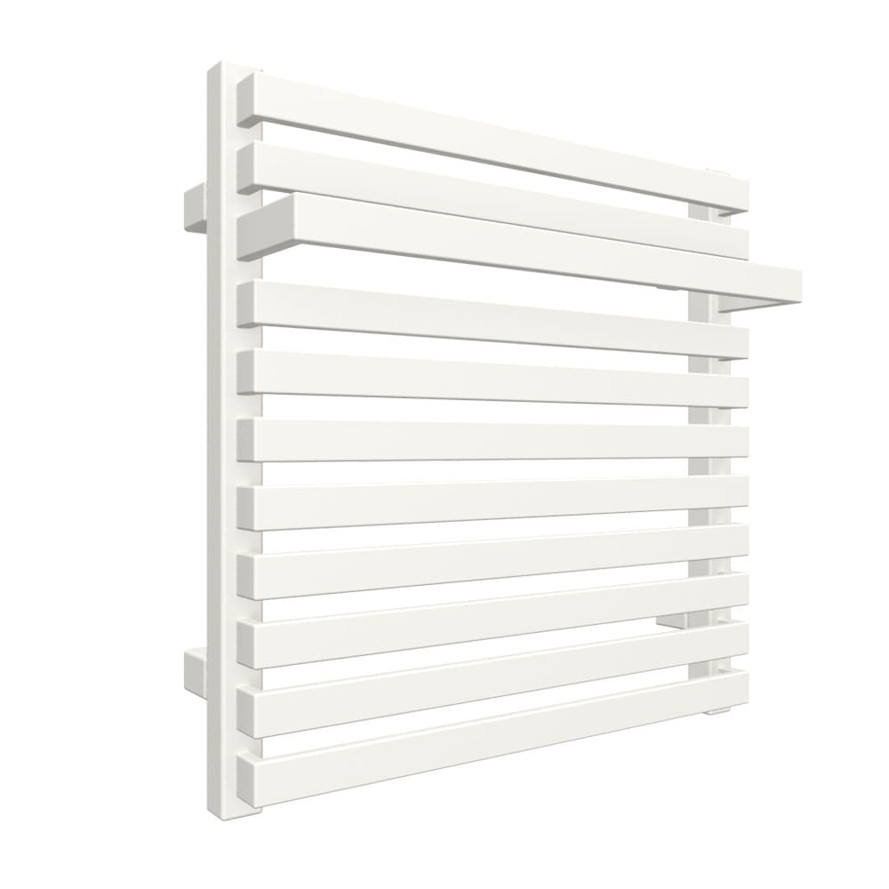 Geometryczna bryła grzejnika CITY zbudowana została z płaskich rurek łączących kolektory o przekroju prostokąta. W górnej części grzejnika jedna z rurek została wysunięta tworząc funkcjonalny wieszak na ręczniki.