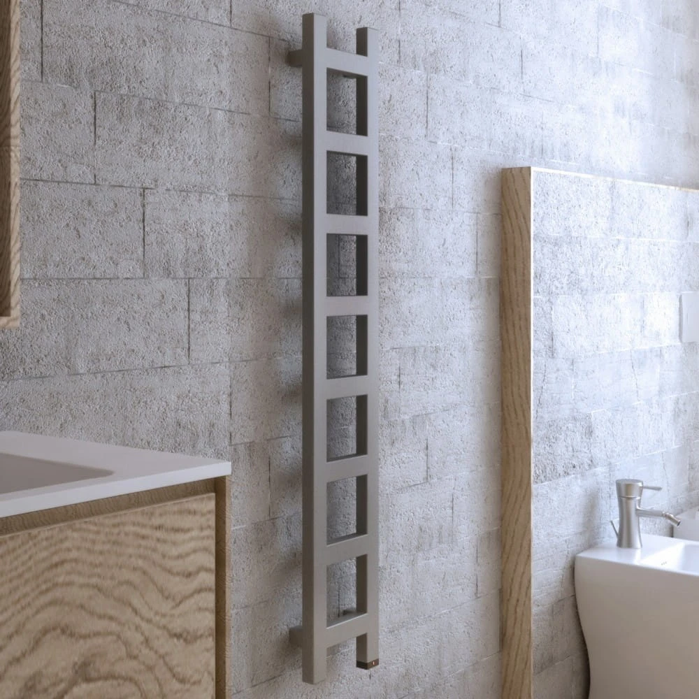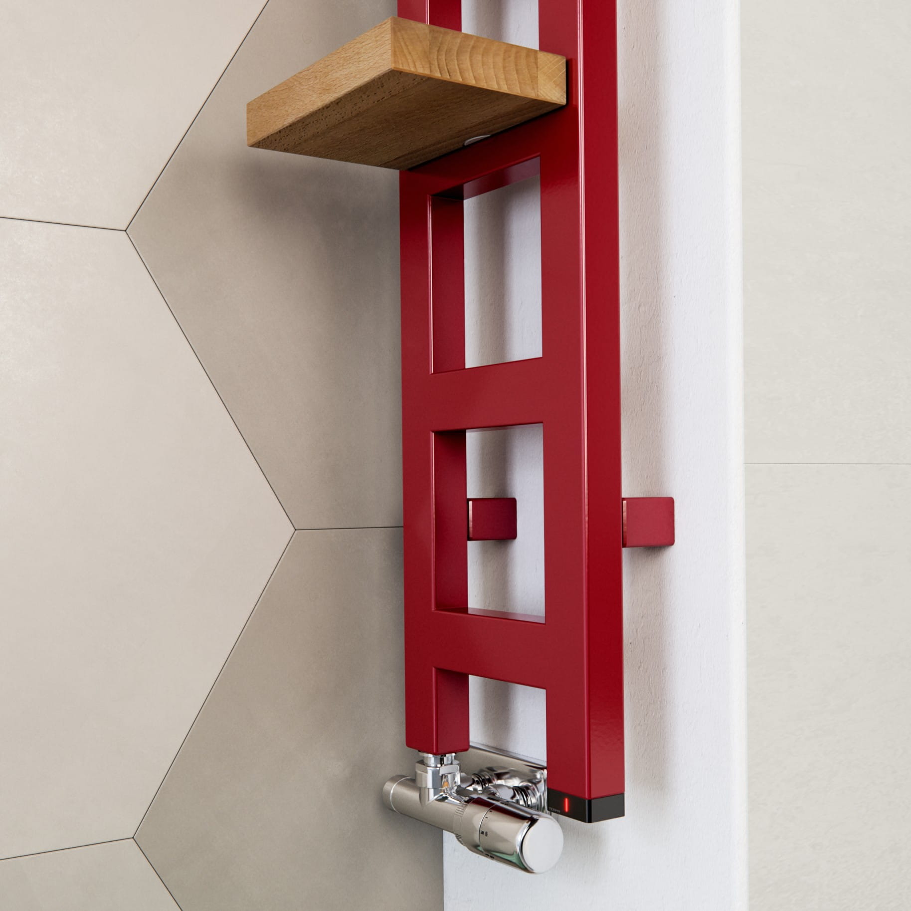Ten elegancki i funkcjonalny grzejnik doskonale sprawdzi się w niewielkich łazienkach, dzięki swojej zaledwie 20-centymetrowej szerokości. Licowane elementy konstrukcji tworzą jednorodną bryłę o płaskiej powierzchni, a drewniane półki w wersjach dąb, buk lub tek dodają mu uroku.