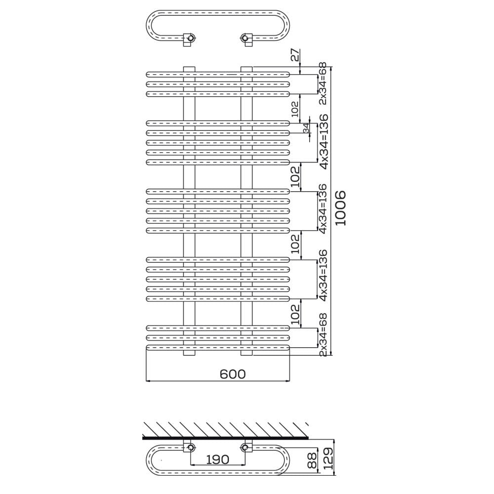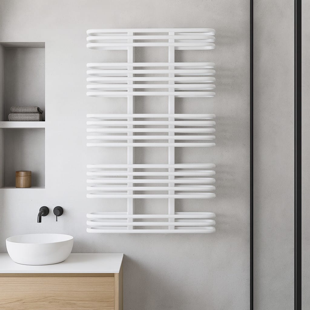 Pamela 101×60 cm to grzejnik dla osób, które potrzebują mocniejszego i szerszego modelu - jego moc 785 W (75/65/20°C) pozwala szybko dogrzać nawet większe wnętrza. Konstrukcja z kolektorów 3×4 cm i rur ø18 mm zapewnia świetny przepływ cieplny, a szerszy układ rur daje wyjątkowo wygodną przestrzeń do suszenia ręczników.