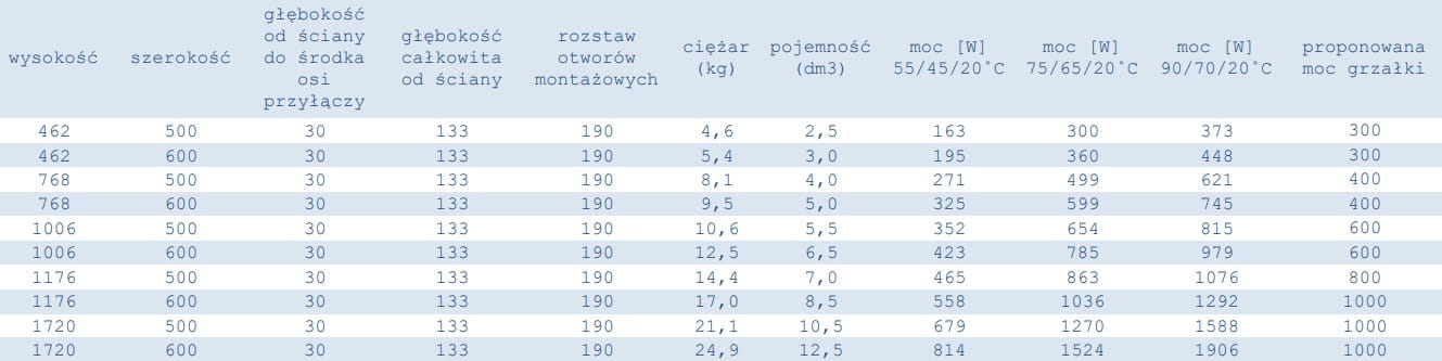 Dane techniczne grzejników