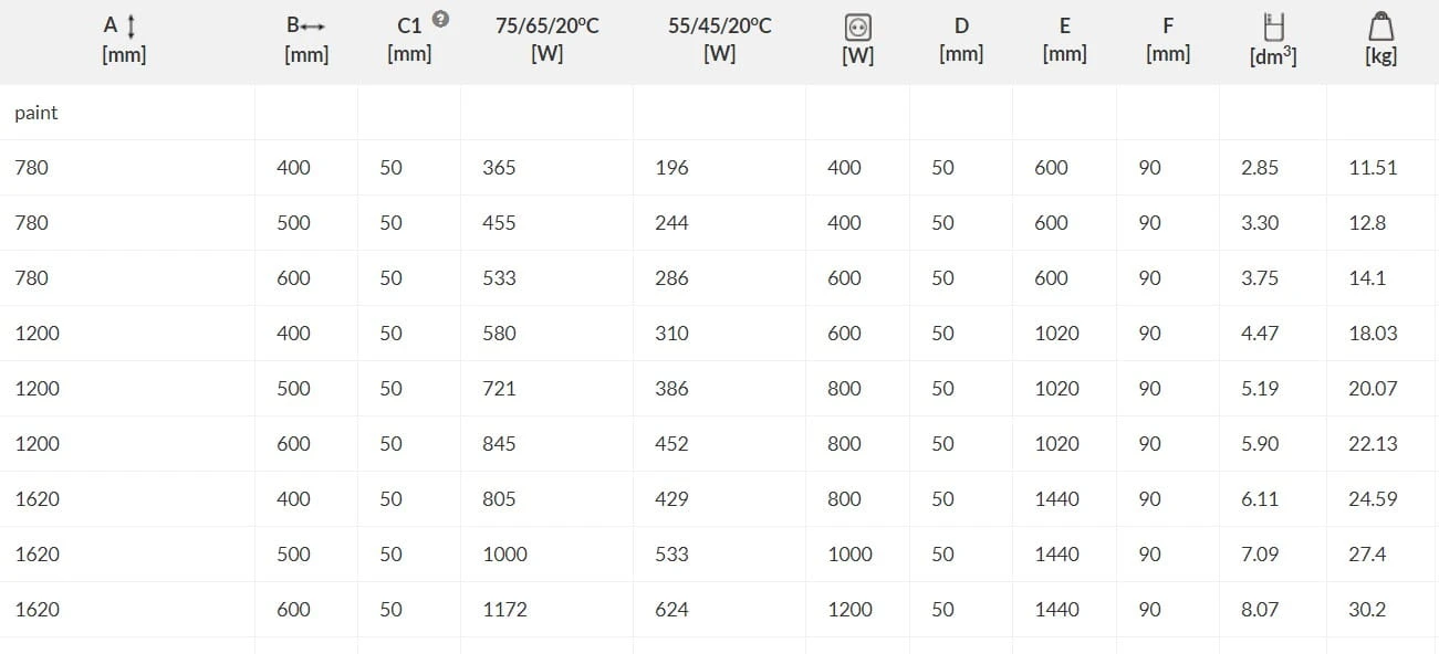 Dane techniczne grzejników