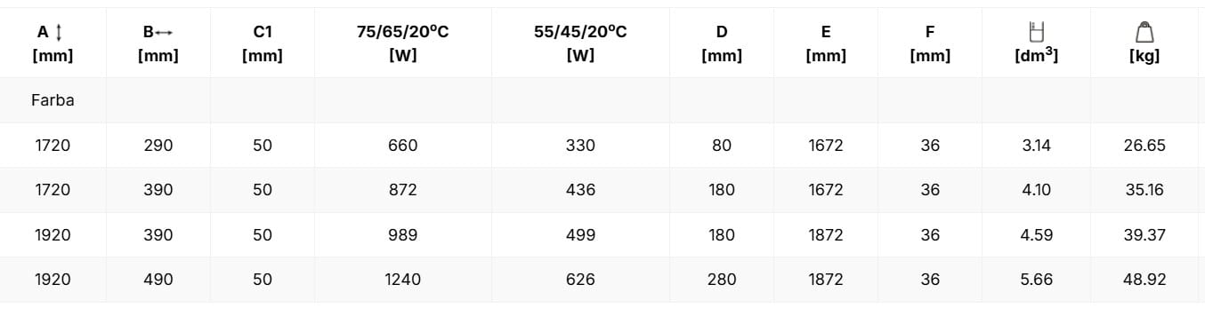 Dane techniczne grzejników