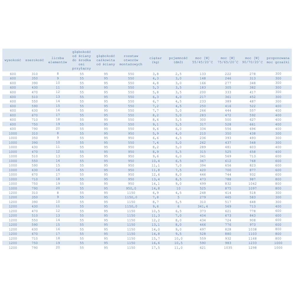 Dane techniczne grzejników