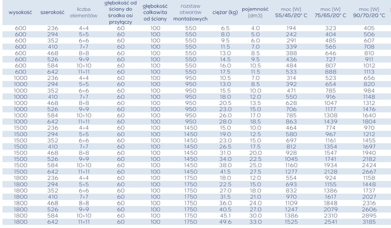 ✅ moc grzejników zależnie od rozmiaru od 170 do 2820 W