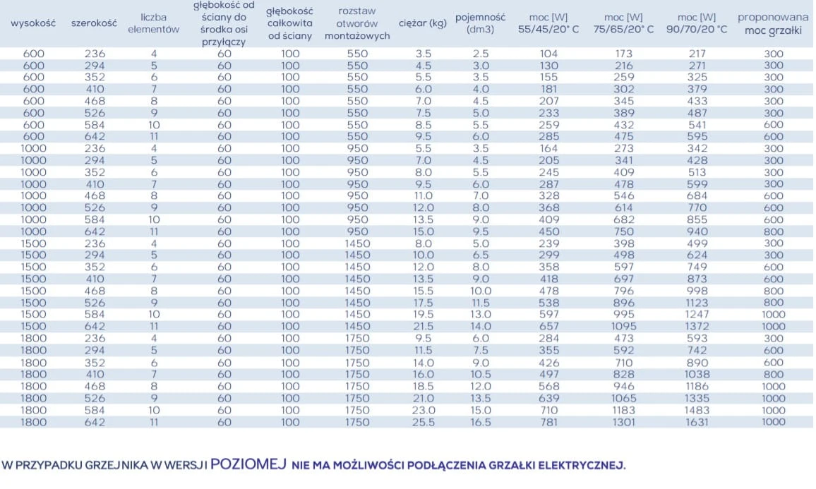 ✅ moc grzejników zależnie od rozmiaru od 170 do 2820 W
