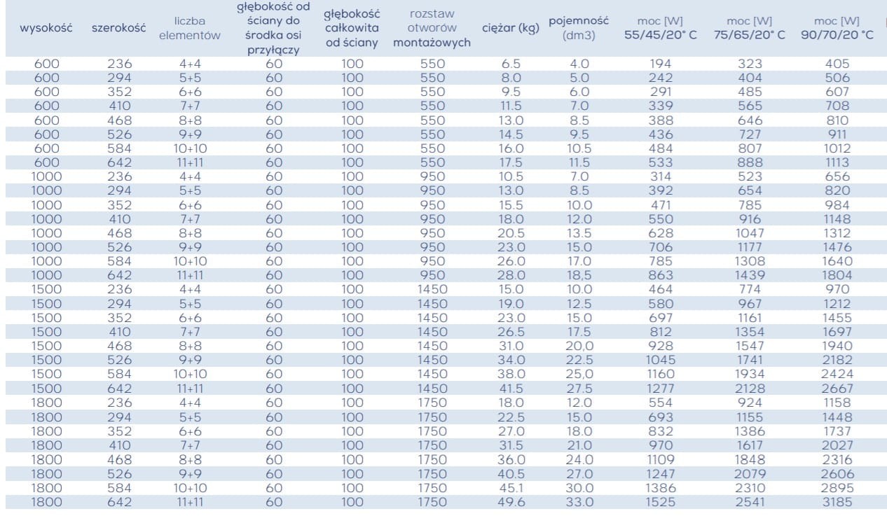 ✅ moc grzejników zależnie od rozmiaru od 170 do 2820 W