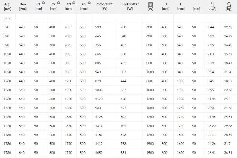 Dane techniczne grzejników