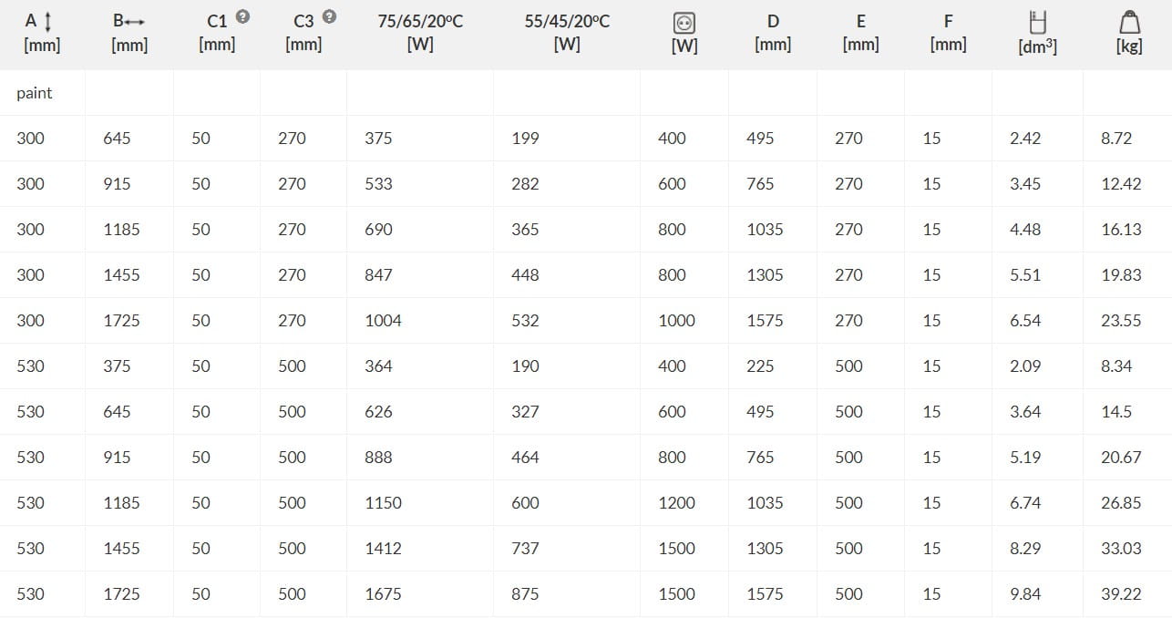 ✅ moc grzejników zależnie od rozmiaru od 370 do 1670 W