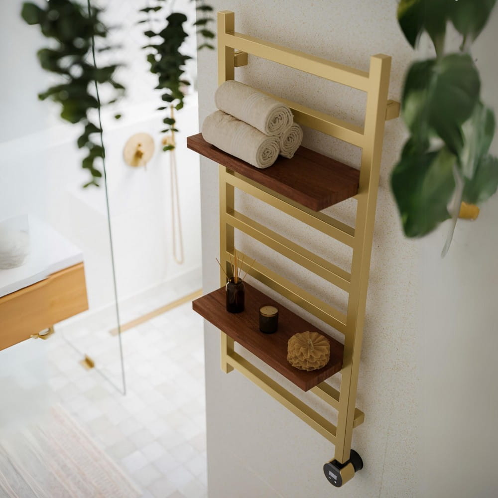 Dzięki bezszwowej konstrukcji oraz specjalnie zaprojektowanym wieszakom, ten grzejnik wnosi do łazienki nie tylko ciepło, ale również styl. Dodatkowo, drewniane półki dostępne w ofercie zwiększają możliwości przechowywania i dekoracji.