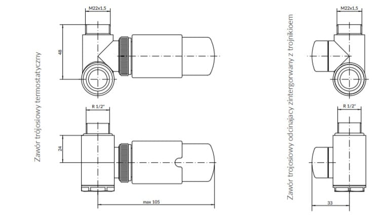 - Zawór trójosiowy termostatyczny z możliwością montażu grzałki