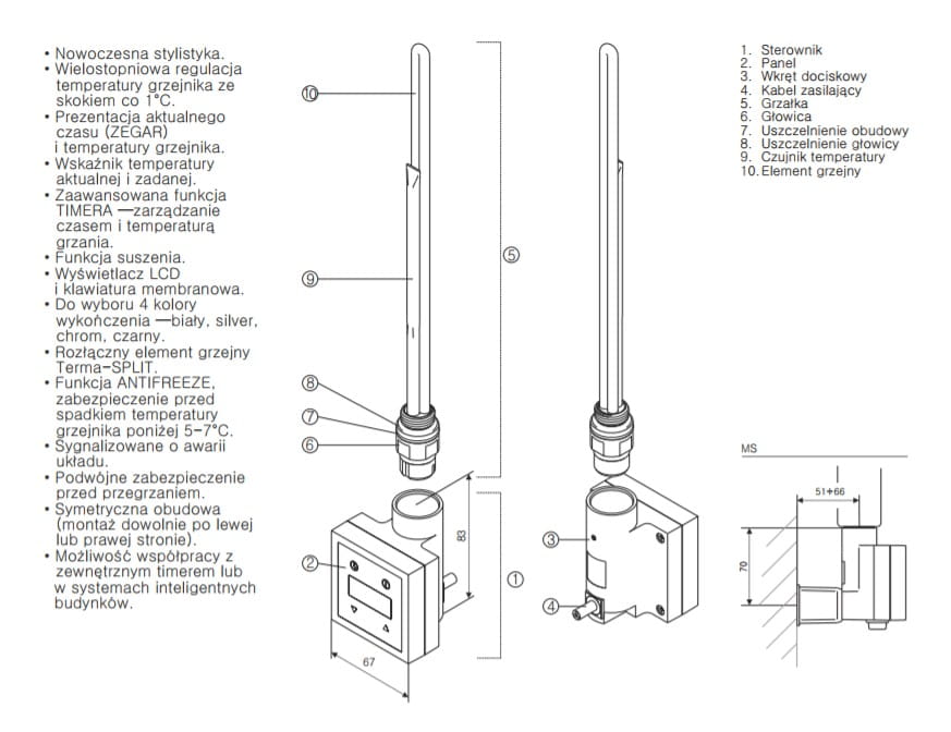 Grzałka posiada możliwość precyzyjnej regulacji temperatury grzejnika w zakresie od 30°C do 60°C z krokiem co 1°C. Urządzenie prezentuje aktualnie nastawiony poziom temperatury oraz sygnalizuje stan grzania i spoczynku. Interfejs grzałki umożliwia jej łatwe programowanie i obsługę. Grzałka zaprojektowana została w Systemie Terma-Split, umożliwiającym rozłączanie elementu grzejnego i sterownika.