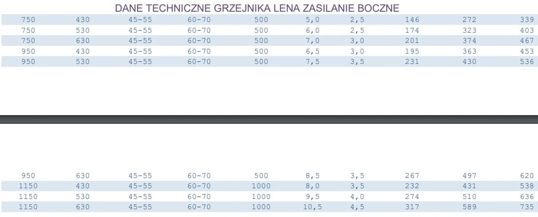 Dane techniczne grzejników