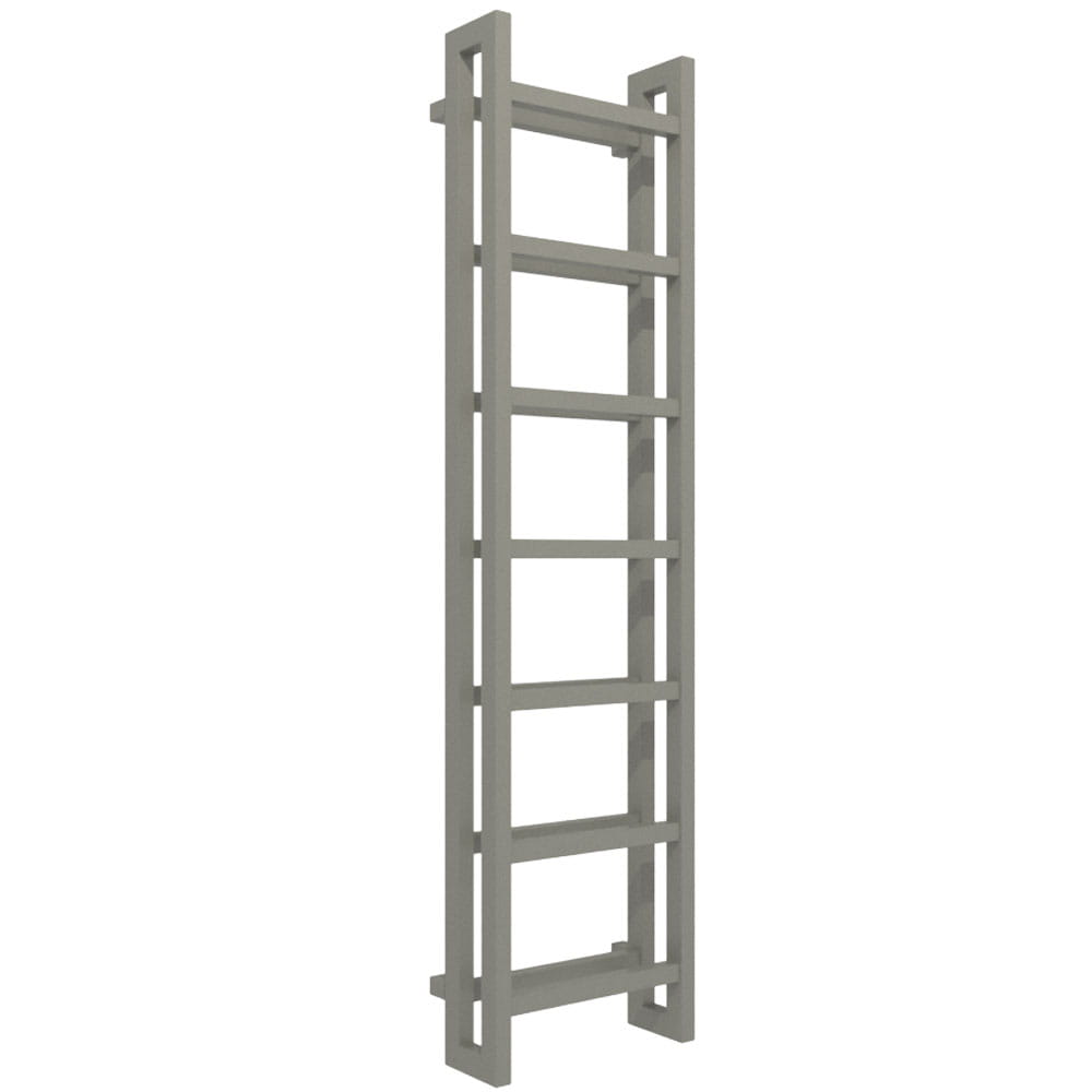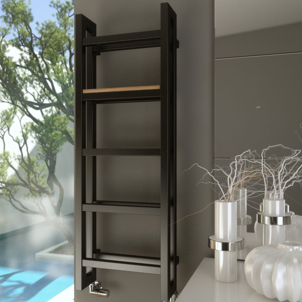 Jego stalowe profile osadzone na kwadratowych kolektorach nadają mu nowoczesny wygląd, a dwuwarstwowa konstrukcja umożliwia montaż drewnianych półek, które uczynią go nie tylko źródłem ciepła, ale także designerskim regałem.