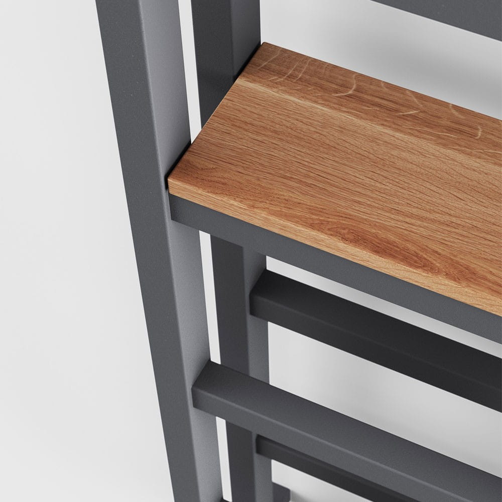Dzięki dwuwarstwowej konstrukcji oraz możliwości zamontowania drewnianych półek, ten grzejnik staje się nie tylko źródłem ciepła, ale również stylowym regałem.