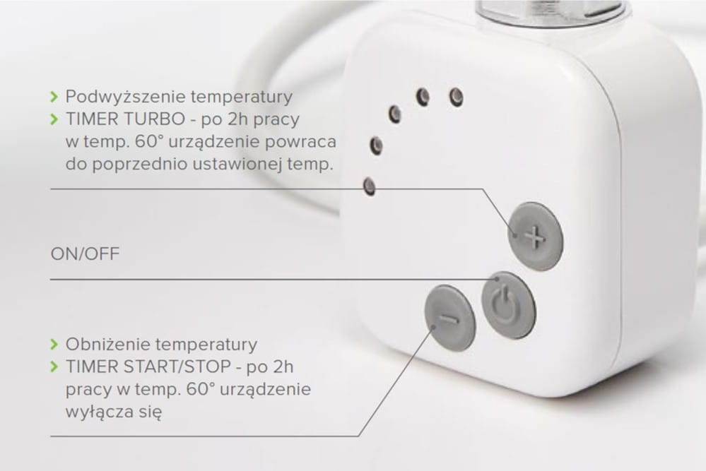 - timer "2h off" - po czasie 2h wyłączenie grzałki
