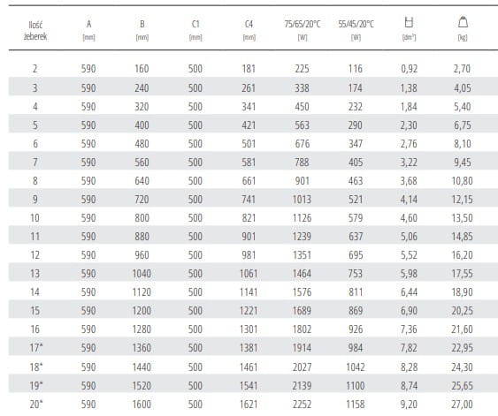 ✅ moc grzejnika zależnie od rozmiaru od 225 do 2252 W