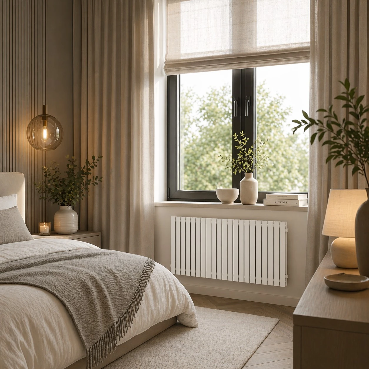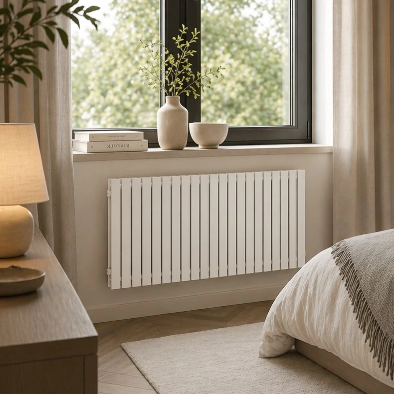 Biała powierzchnia delikatnie odbija światło, dzięki czemu wnętrze wydaje się jaśniejsze i bardziej harmonijne. To grzejnik, który nie dominuje przestrzeni, ale ją uzupełnia, dokładnie tam, gdzie liczy się detal i spójność.