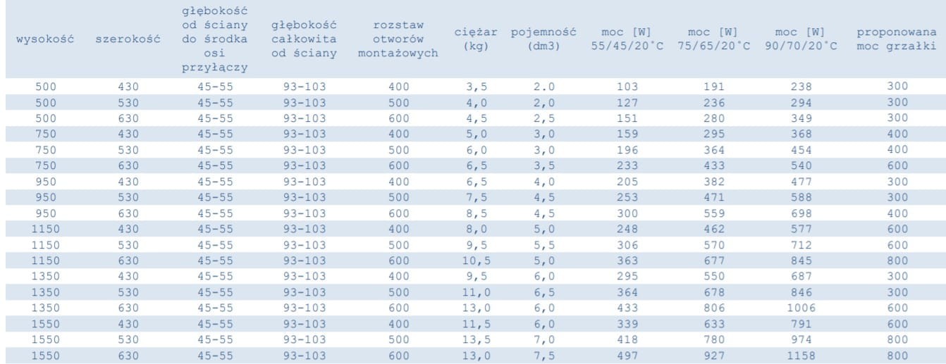 Dane techniczne grzejników